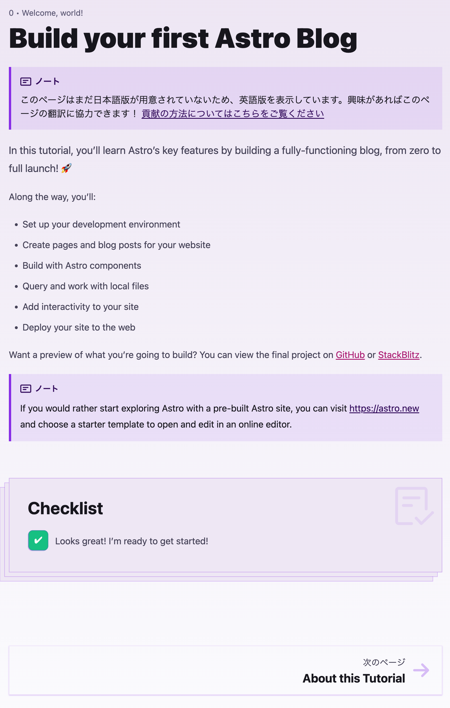 公式の Astro を選ぶ理由を読むとブログ作るならこれでいいかーという気持ちになったのと、実際にブログを作るためのチュートリアルがしっかりありこのブログもデザイン以外の部分はほぼこのチュートリアルを進めただけの内容になっています。タグの実装とか本当にコピペ。